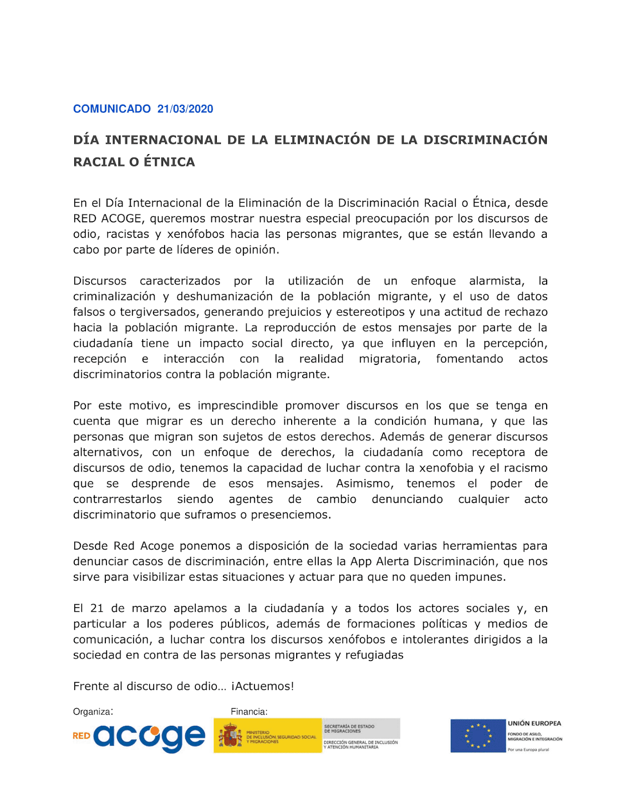 Este 21 de marzo apelamos a la ciudadanía y a todos los actores sociales y, en particular a los poderes públicos, además de formaciones políticas y medios de comunicación, a luchar contra los discursos xenófobos e intolerantes dirigidos a la sociedad en contra de las personas migrantes y refugiadas.