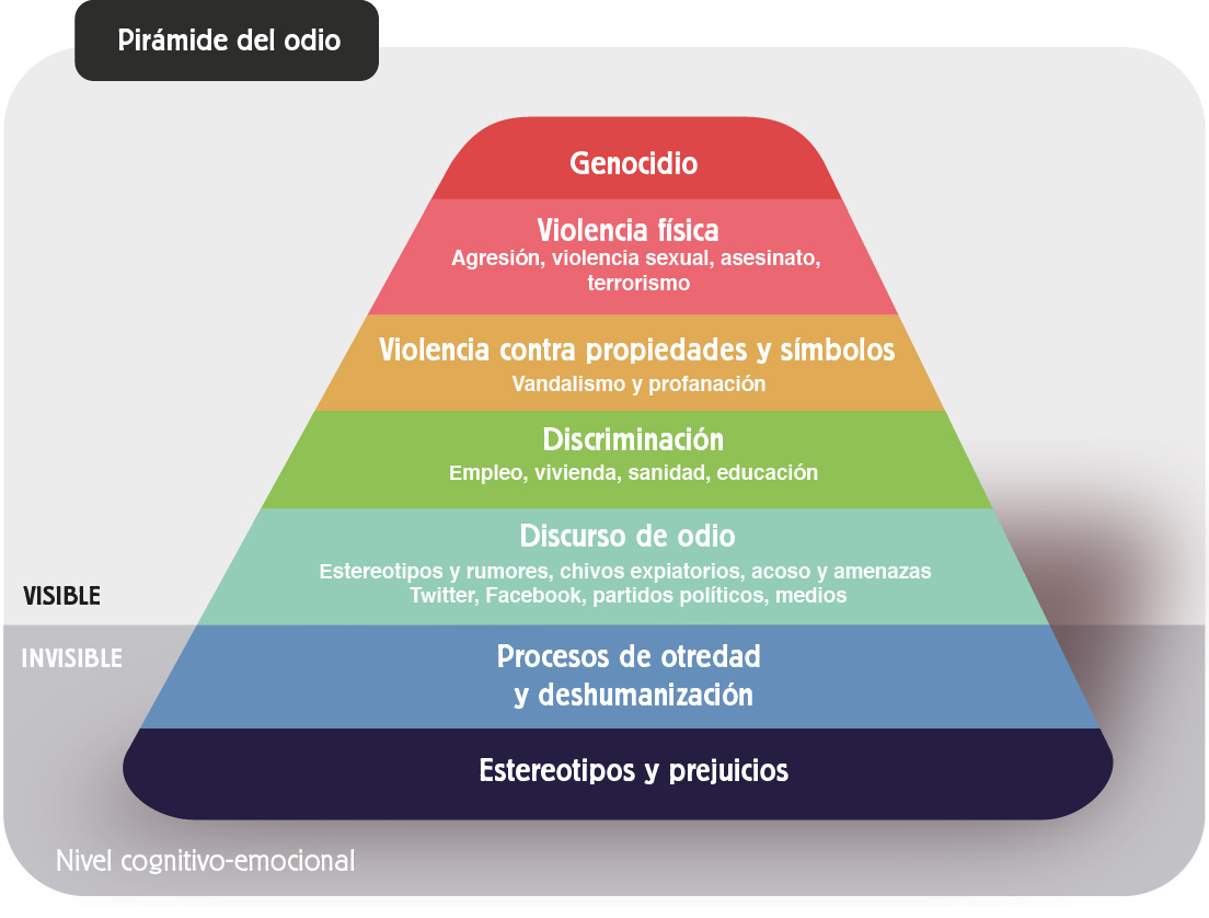 | Distintos niveles de discurso del odio y delitos de odio. Se catalogan diferentes tipos de actitudes y actos que crecen en complejidad desde la base hacia la cúspide de la pirámide |